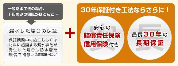 最大30年の保証と、万が一の場合の保険でWで安心の防水工法をご紹介します。